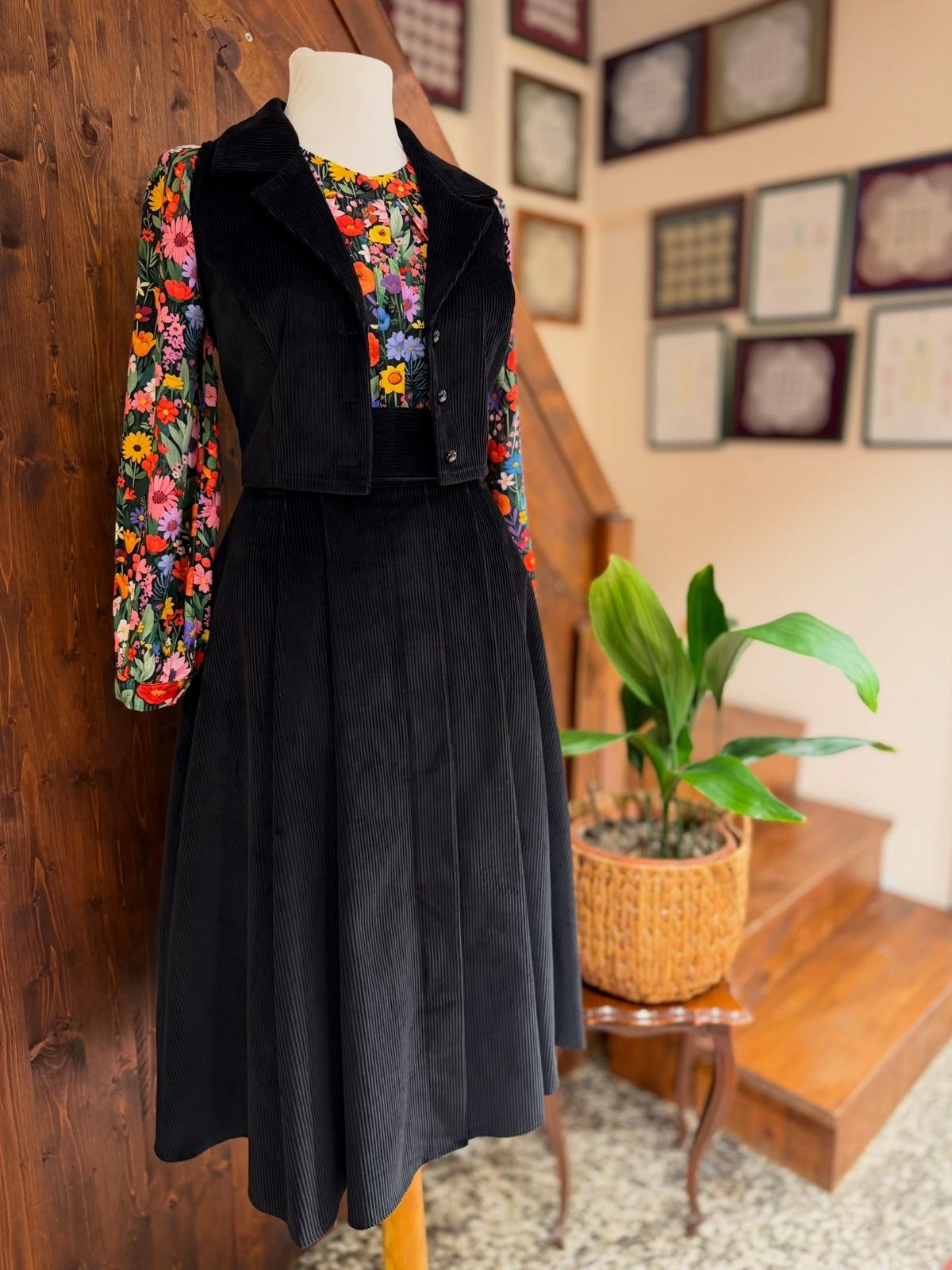 %100 kadife kumaşın yumuşak dokusu ve derin tonu, tasarıma asil bir karakter kazandırırken; akıcı etek formu hareket özgürlüğü ve konfor sunar.