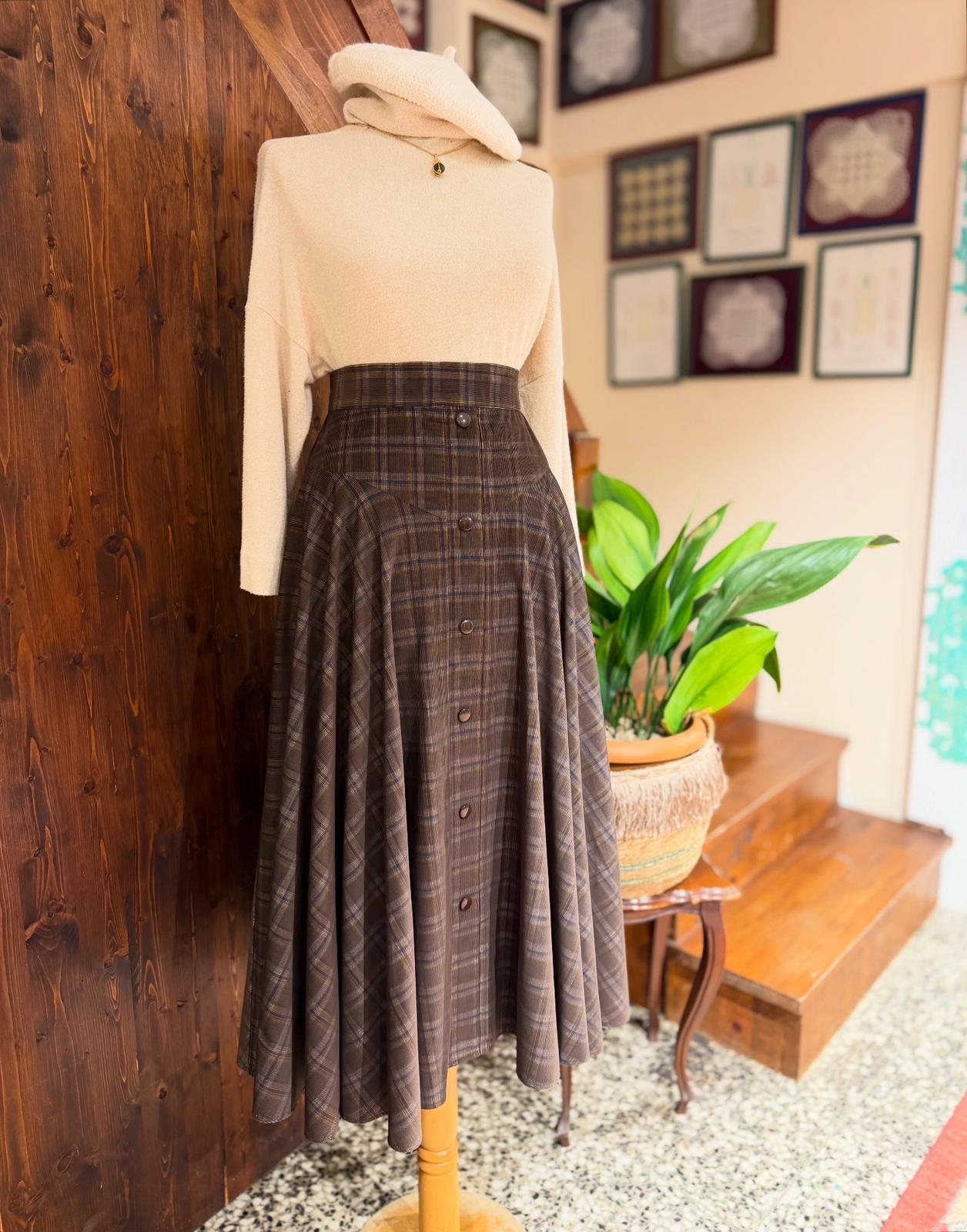 Yüksek bel formu, silueti doğal bir zarafetle yükseltirken; hafiflik ve konforu önden devam eden düğme dizilimi eteğe nostaljik ve rafine bir karakter kazandırır.
